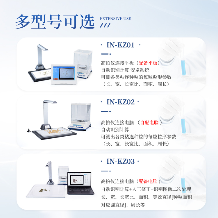 智能考种系统可以测量各种表面光滑的籽粒的数量、千/百粒重与平均粒型(包括长、宽、长宽比、周长、面积),利用图像ORC 识别技术、图像定位、空间转换等技术实现快速识别种子数量及作物性状指标。