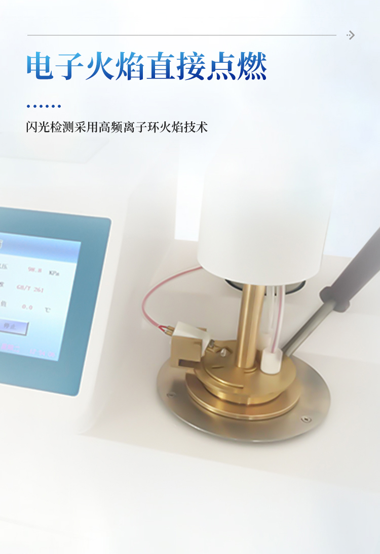 仪器按照GB/T 261-2021方法规定的升温曲线加热,温度接近预期闪点值时自动点火,当出现闪点时仪器自动锁定结果,并显示和打印,同时启动风机自动对加热器进行冷却。