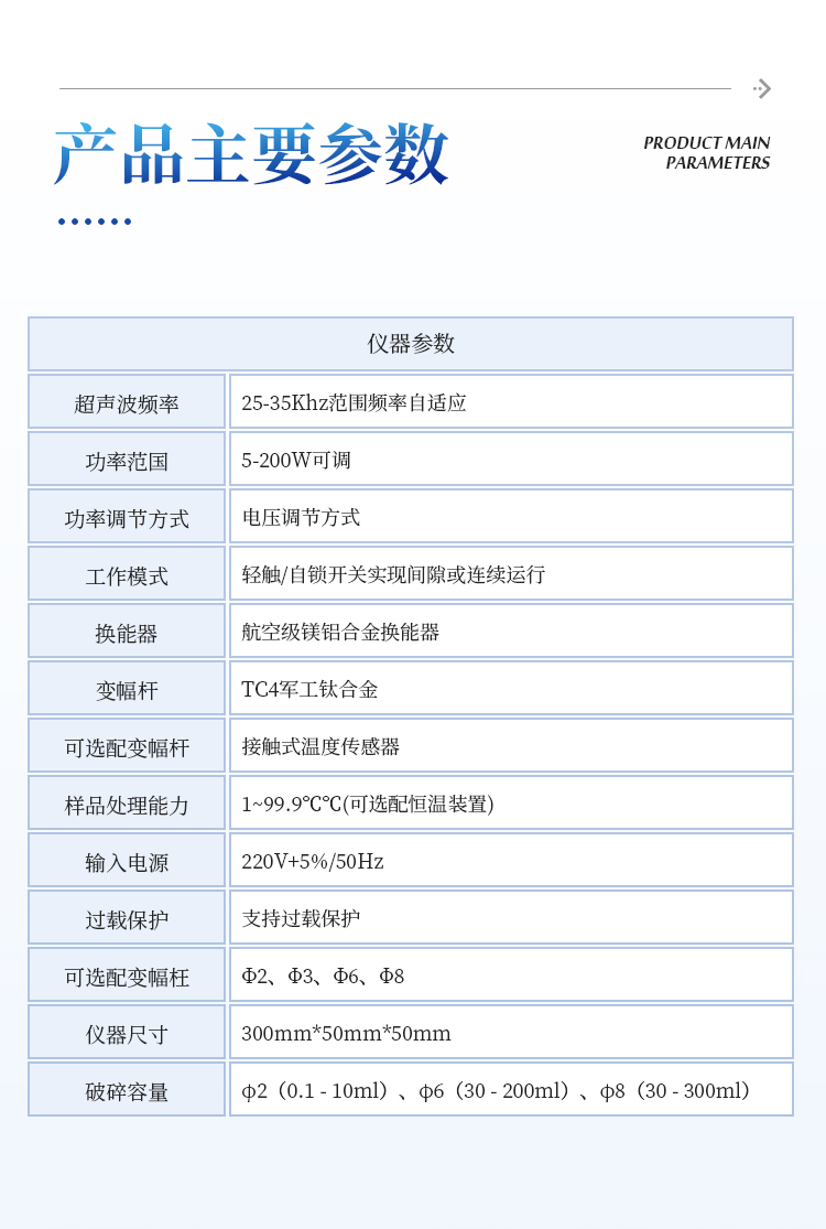 超声波细胞破碎仪是一种利用强超声在液体中产生空化效应,对物质进行超声处理的多功能、多用途的仪器,能用于动植物组织、细胞、细菌、芽胞菌种的破碎,同时可用来乳化、分离、分散、匀化、提取、脱气、清洗及加速化学反应等等。