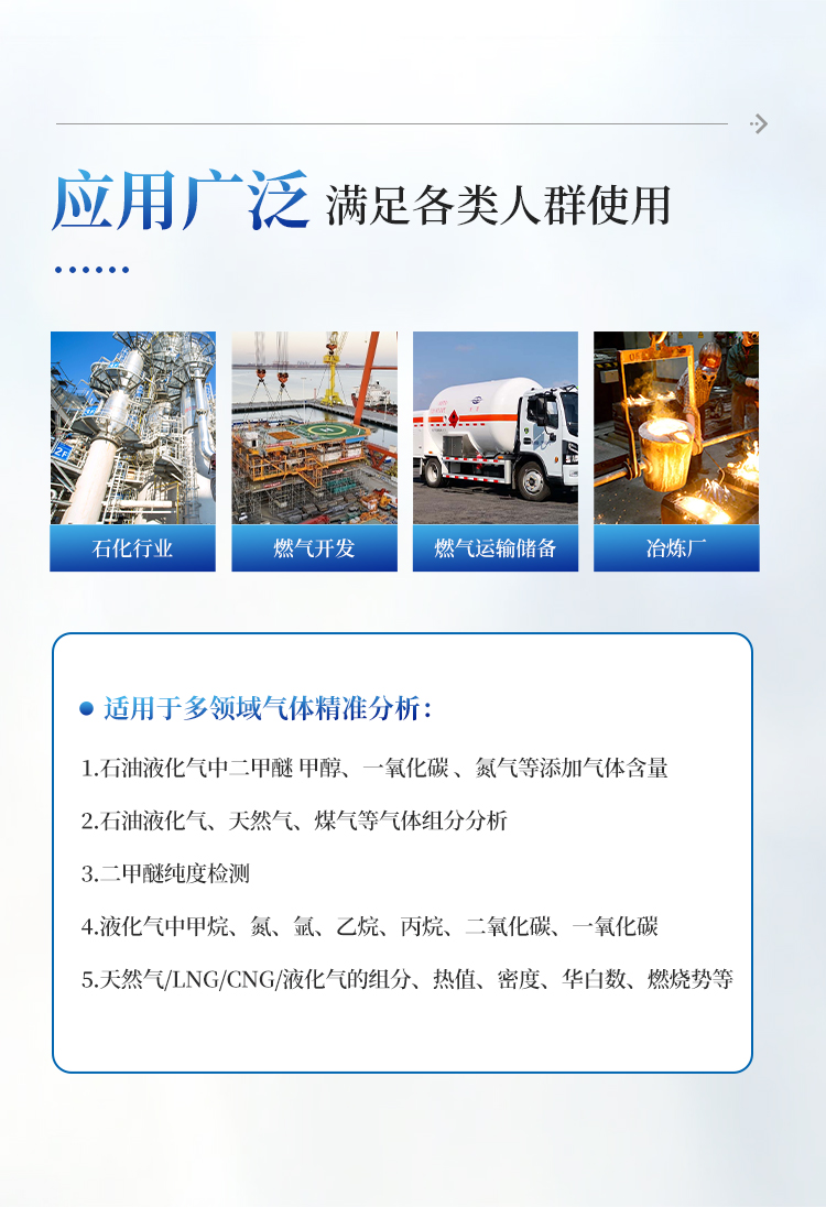 1.石油液化气中二甲醚 、 甲醇 、 一氧化碳 、 氮气等添加气体含量 2.石油液化气 、 天然气 、 煤气等气体组分