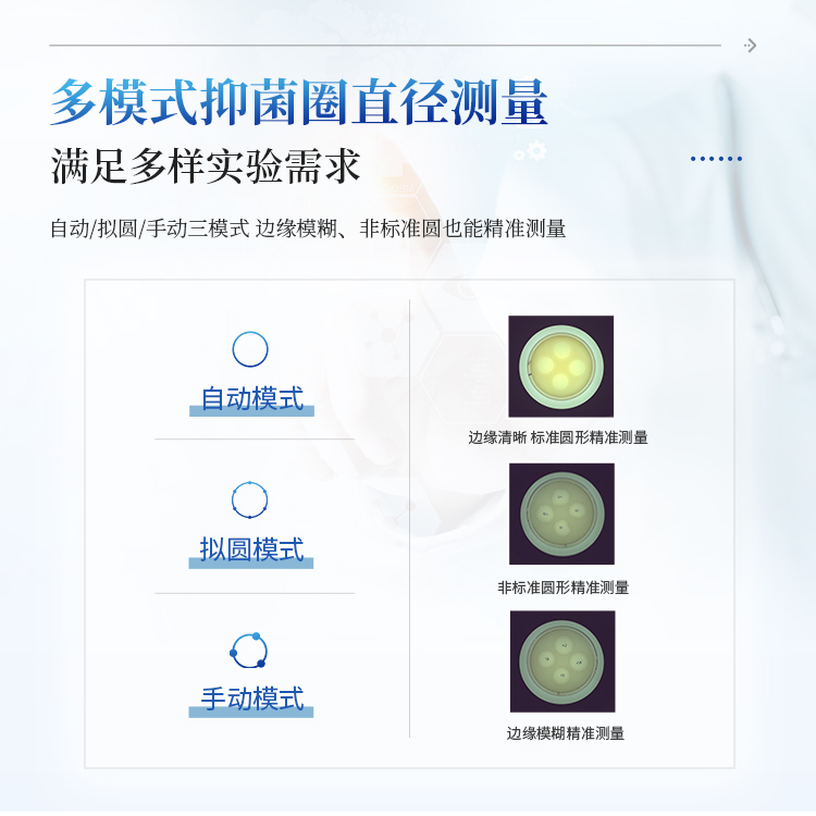 本产品为集图像采集、数据处理与统计分析于一体的抑菌圈测量仪,广泛应用于食品、药品、化妆品、环境监测、医疗卫生、科研院校等领域。该仪器采用先进数字图像处理技术,能快速、精准、全自动地测量培养皿中抑菌圈的直径,并同步自动完成效价计算,大幅提升实验操作效率,有效降低人工测量误差。