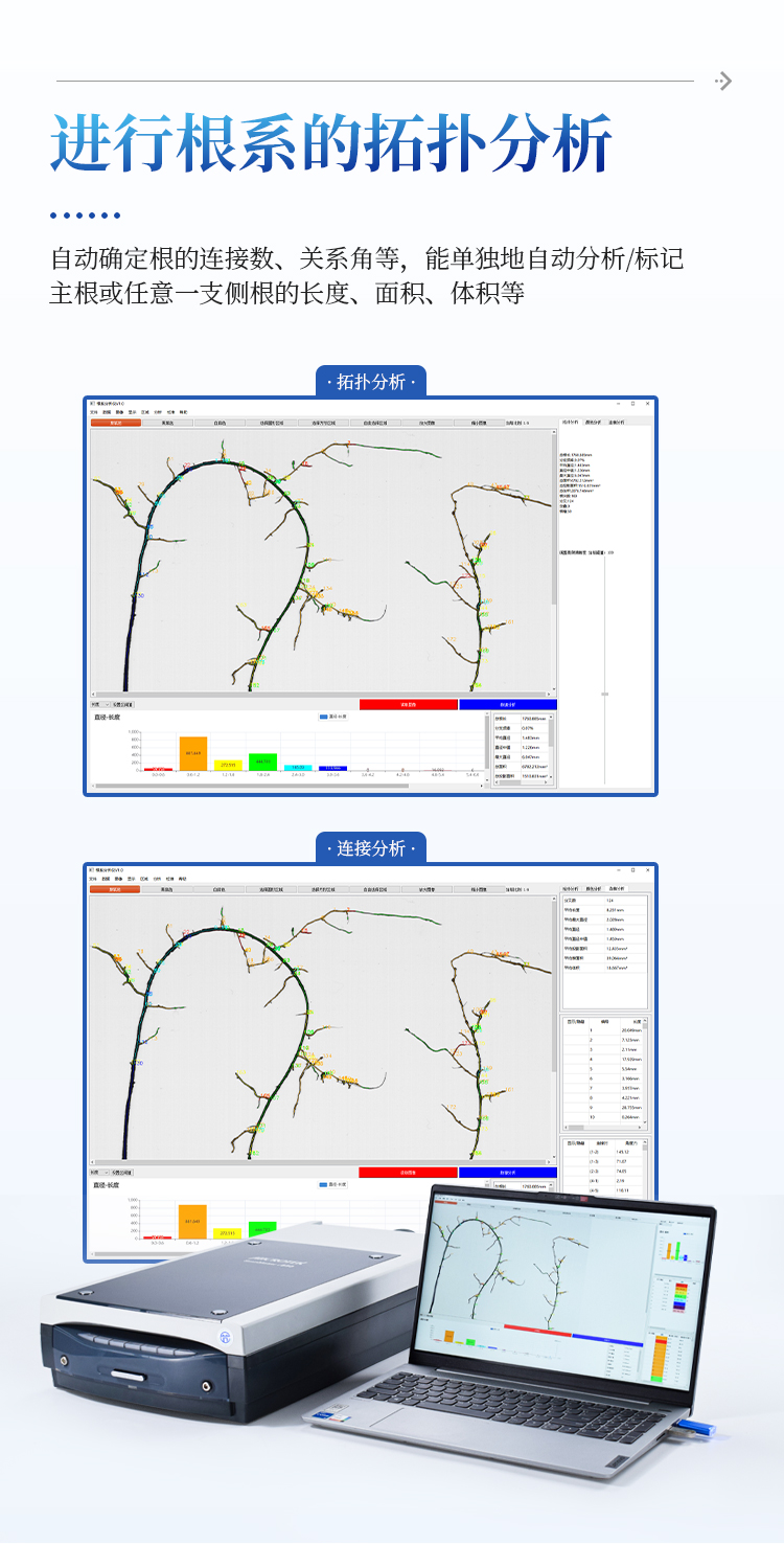 植物根系扫描系统能进行根系的拓扑分析,自动确定根的连接数、关系角等,还能单独地自动分析主根或任意一支侧根的长度和分叉数等,可单独显示标记根系的任意直径段相应各参数