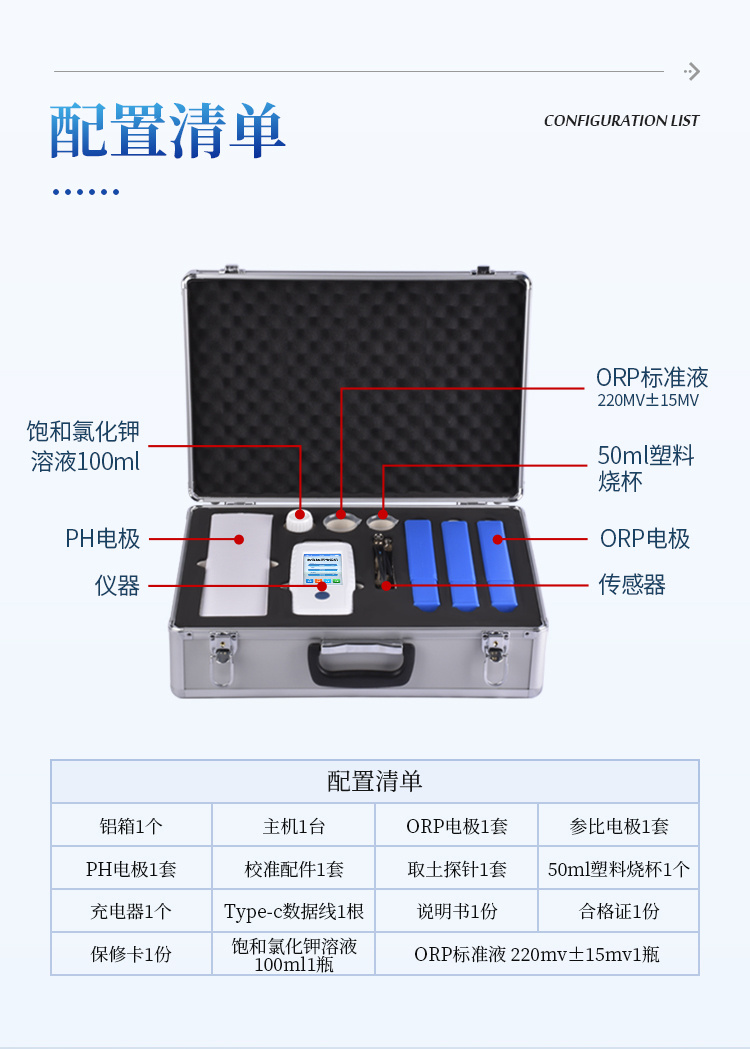 ●配套专用ORP电极、参比电极和不锈钢空心杄,可直接插入土壤