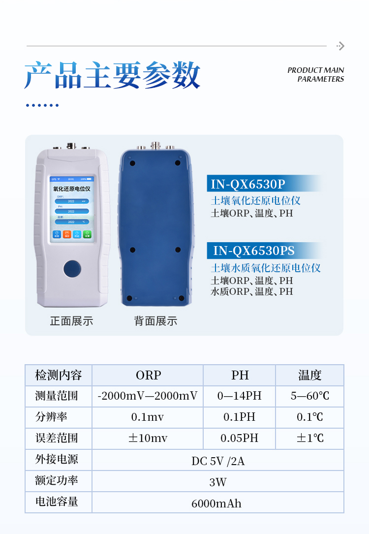 IN-QX6530P土壤氧化还原电位仪(ORP计)主要用于现场原位测试新鲜或湿润土壤的氧化还原电位,水(介质)氧化还原电位、PH、温度等数据的测量。符合《HJ746-2015土壤氧化还原电位的测定电位法》标准。