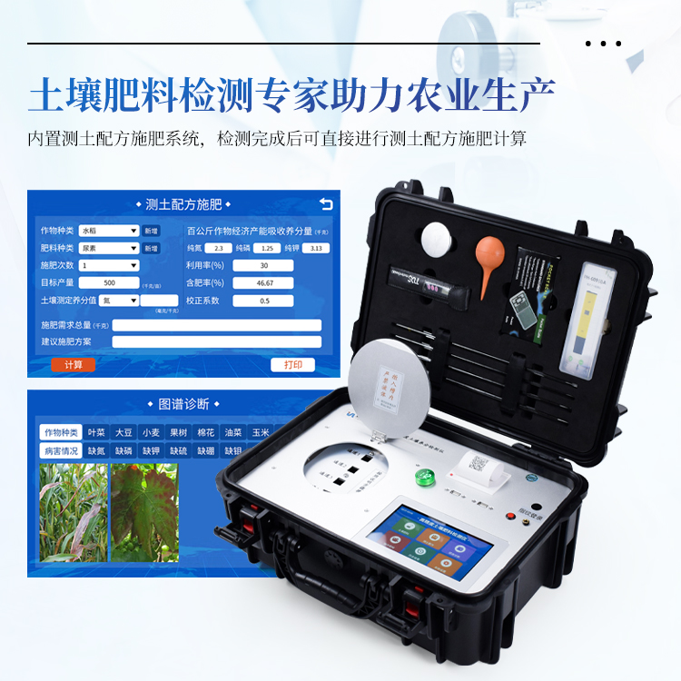 16.内置测土配方施肥系统,检测完成后可直接进行测土配方施肥计算;同时具有单独配方施肥计算模块;仪器内置百余种常见经济作物标准养分值,内置施肥校正系数,可对目标产量计算施肥量,以此指导农业生产;测土配方施肥结果可打印,打印内容包含作物种类、肥料种类、目标产量、需求总量、建议施肥方案。