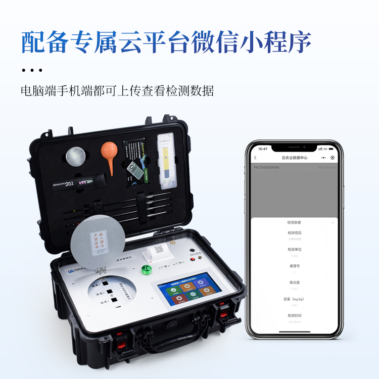 7.数据打印:内置热敏打印机(无需更换色带),可打印出检测项目、检测单位、检测人员、检测时间、通道号、吸光度、养分含量(mg/kg)、以及二维码等信息。