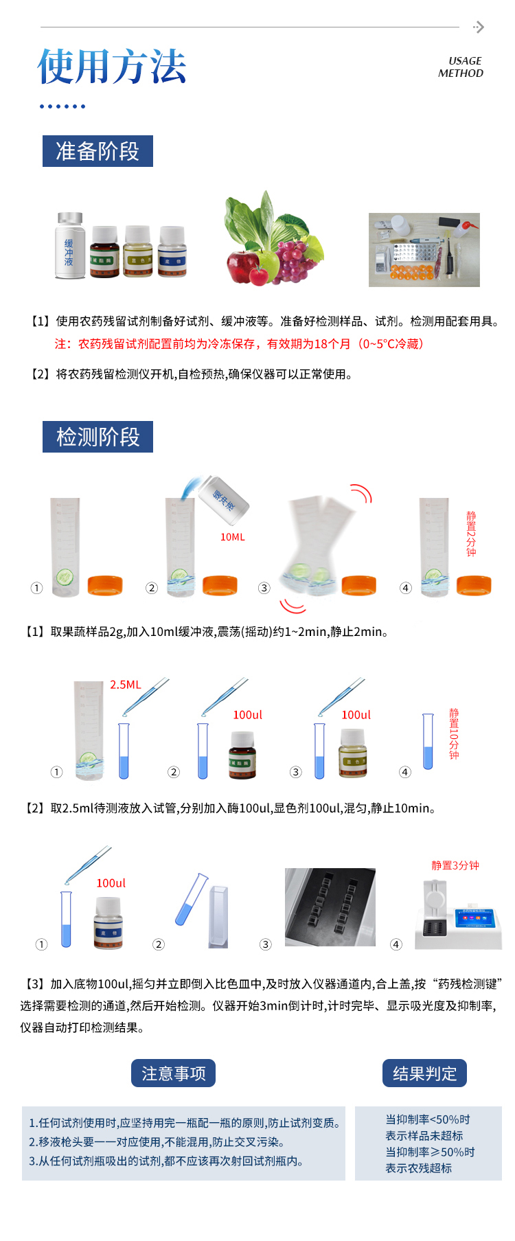 检测标准:依据相关标准方法(GB/T5009.199-2003)以及世界卫生组织WHO、世界粮农组织FAO残留农药检测标准、世界环境保护局EPA参照摄入量等要求来设计。采用酶抑制率比色法对水果、蔬菜等农林产品中有机磷和氨基甲酸酯类农药含量进行快速准确的检测。