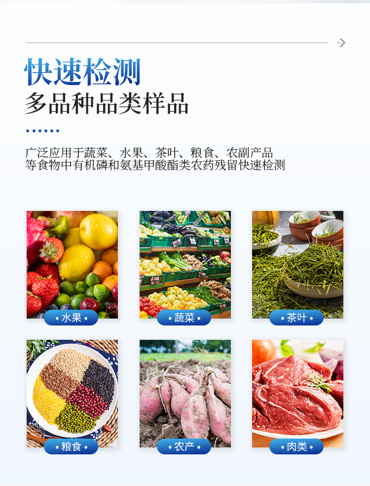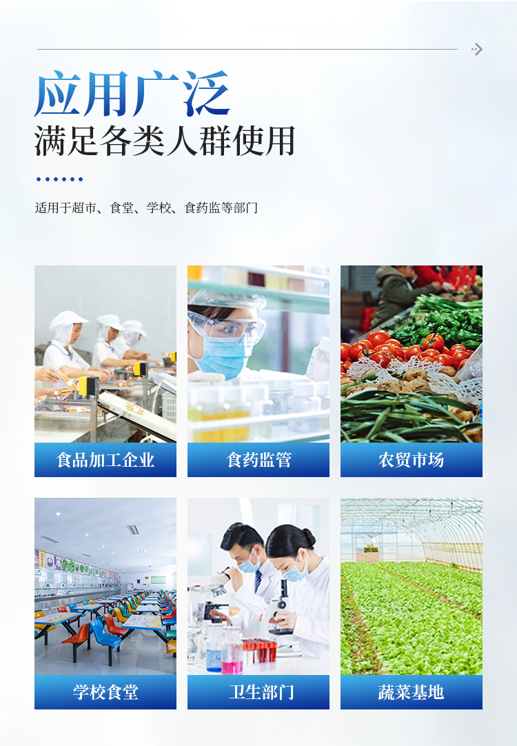 广泛应用于主要用于蔬菜、水果、茶叶、粮食、农副产品等食品中有机磷和氨基甲酸酯类农药残留的快速检测;此外还可用于果蔬茶生产基地和农贸批发销售市场现场检测,餐馆、学校、食堂、家庭果蔬加工前的安全速测等。
