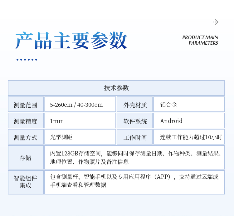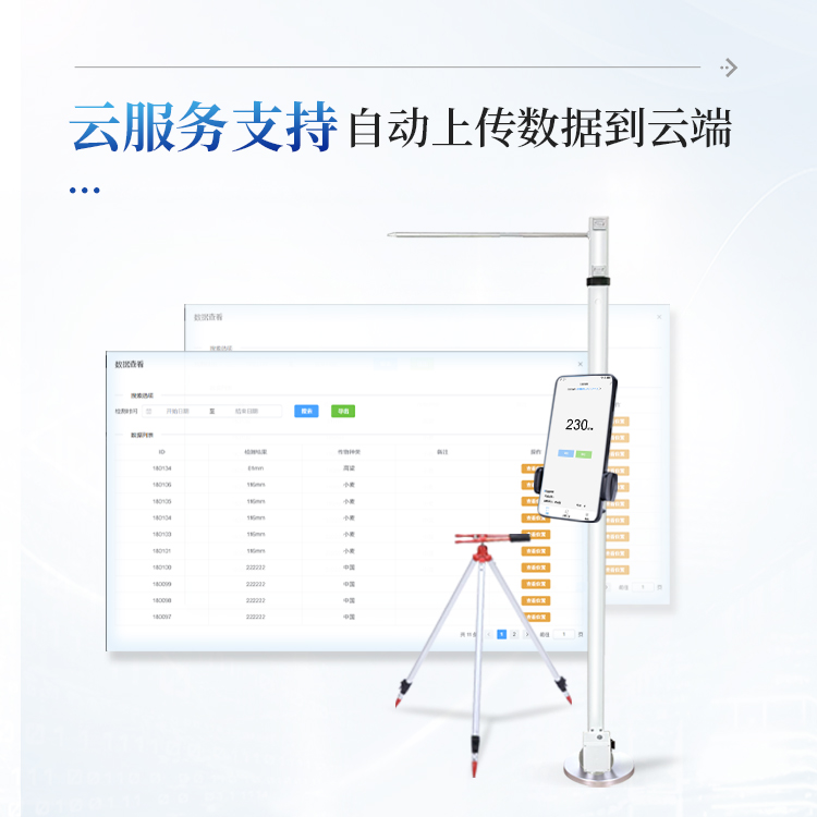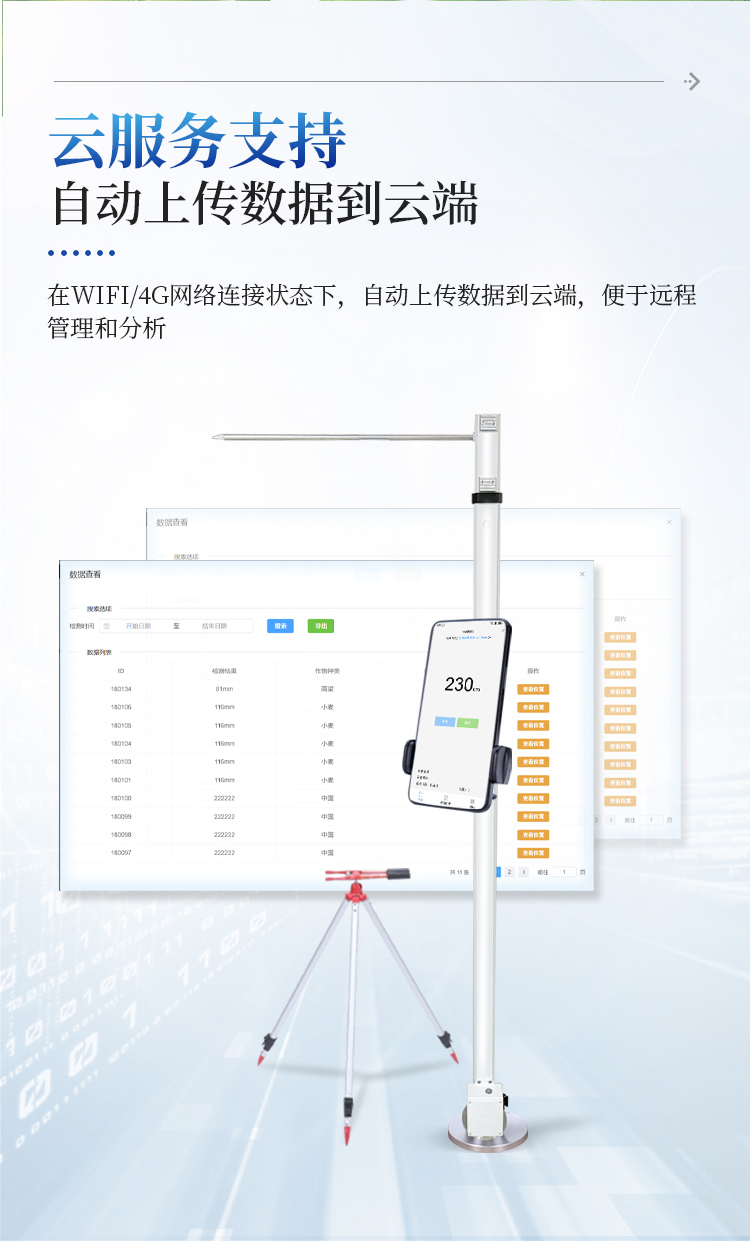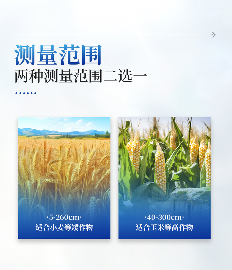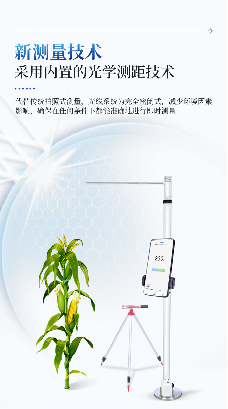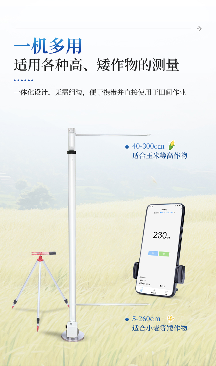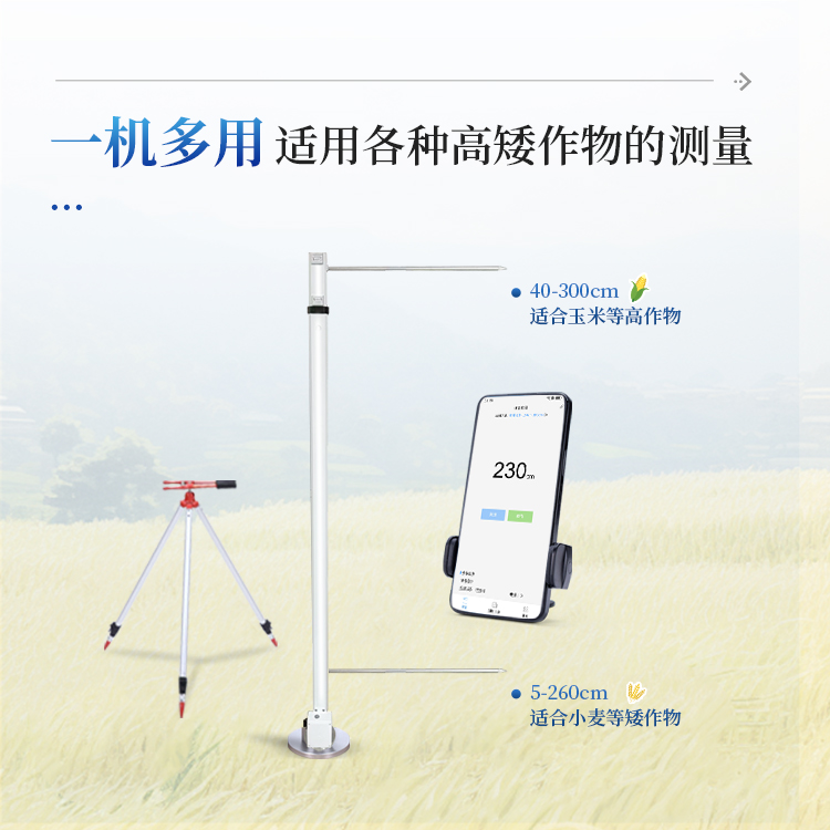 广泛应用性 - 最低测量高度0.05米,最大测量高度2.6米,适用于大多数类型的农作物株高测量需求。