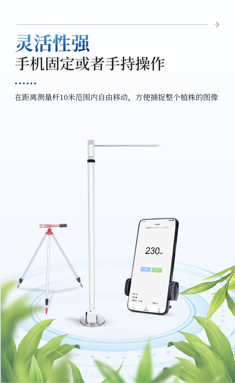 灵活性强 - 手机可以固定或者手持操作,测量过程中可在距离测量杆最远10米范围内自由移动,方便捕捉整个植株的图像。