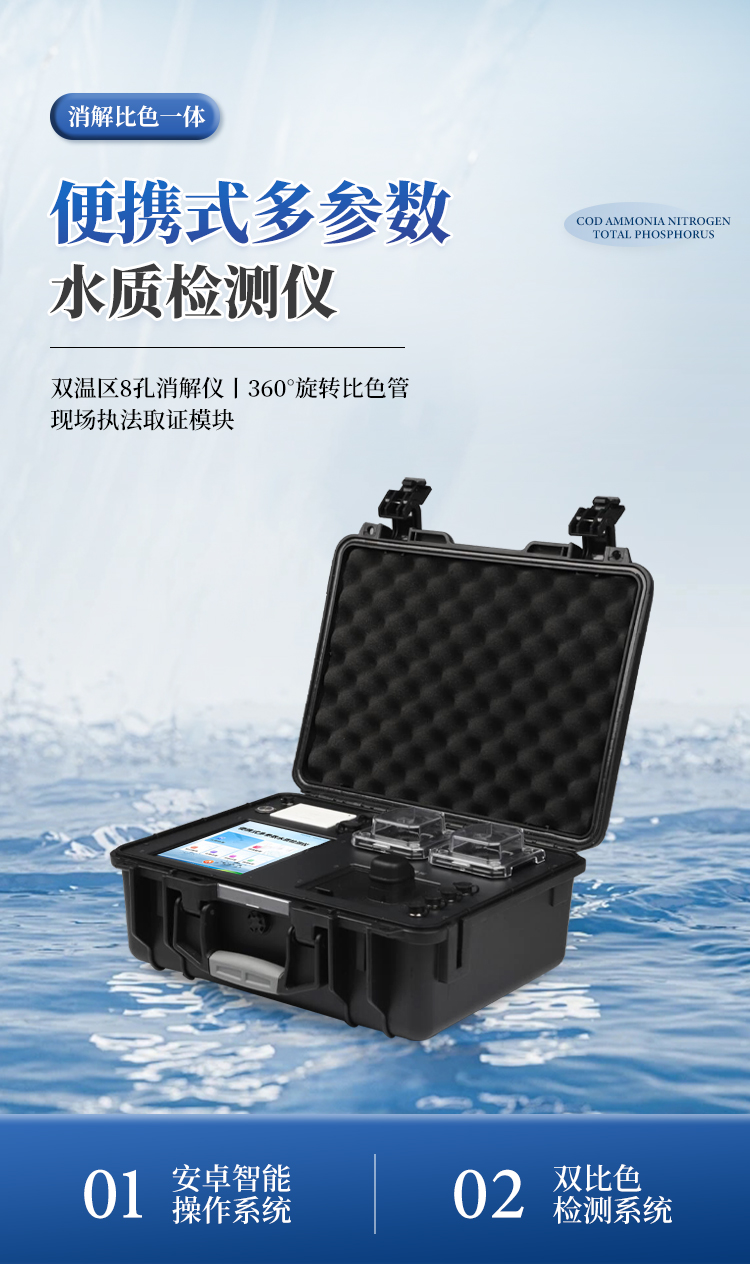 便携一体式多参数水质检测仪采用高强度PVC工程塑料手提箱设计,消解检测一体式设计,其中消解模块具备双温区功能,检测部分同时具备360°旋转比色管检测和比色皿检测,安卓智能操作系统,8英寸高清液晶触摸屏,光纤检测技术,进口光源,内置大容量锂电池,现场执法取证模块,便携多参数水质检测仪具有性能稳定、测量准确、测定范围广、功能强大、操作简单等特点。