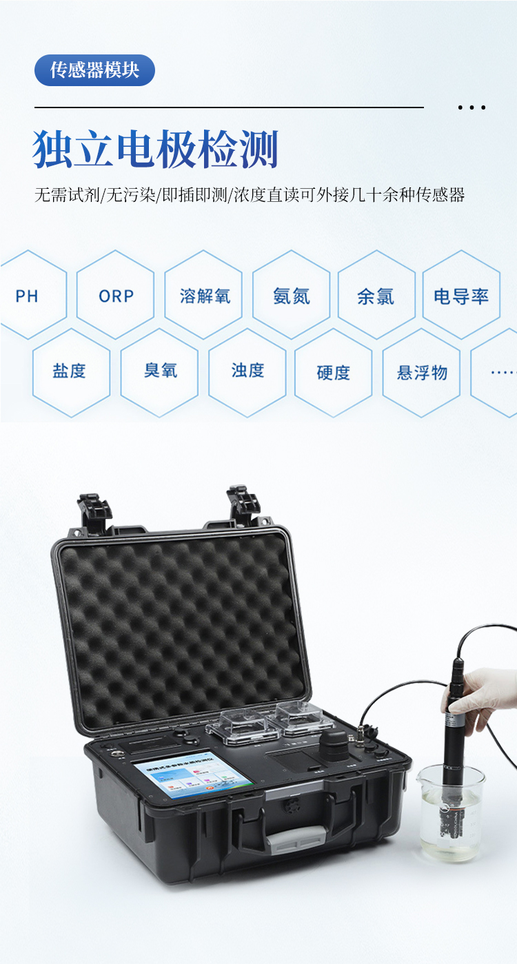 10、内置传感器检测模块,可同时插入4个不同指标传感器同时检测,插入即测,浓度直读。