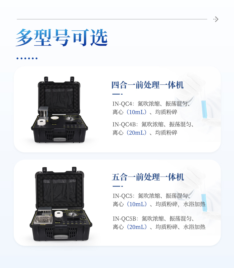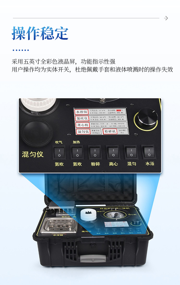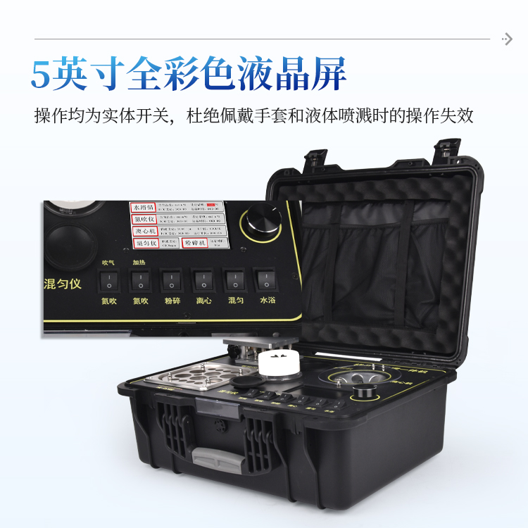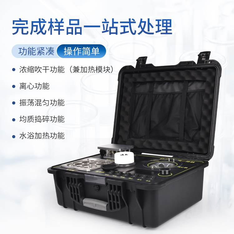 应国内用户的实际需求,自行研制开发的新型仪器——QC05B型样品前处理一体机。样品前处理集成箱将样本前处理过程中样品浓缩、水浴恒温、离心分层、均质、振荡混匀等步骤所需设备进行集成,仅需一台样品前处理集成箱设备即可完成所有样本前处理过程,并且方便携带,不仅适用于现场检测使用,还可用于色谱、质谱等分析样品的纯化和制备。