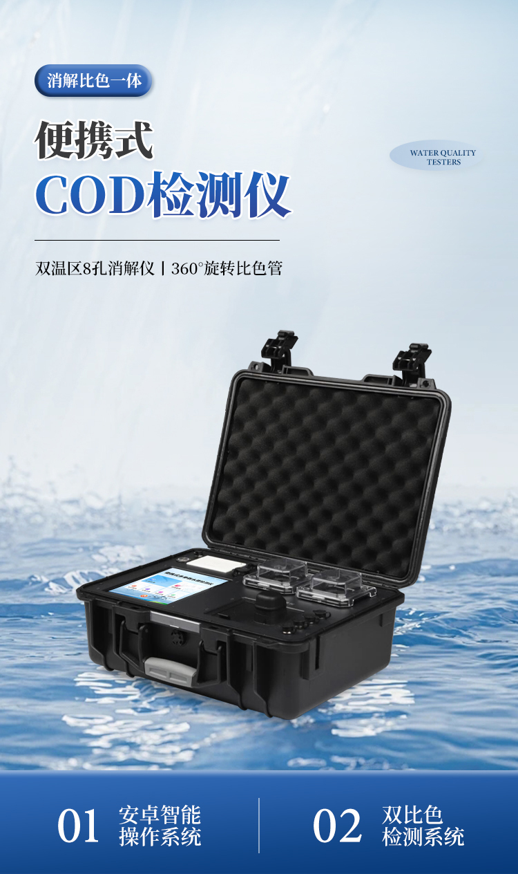 便携多参数水质检测仪一台仪器集成两种快速检测原理方法(分光法和电极法),采用高强度PVC工程塑料手提箱设计,消解检测一体式设计,其中消解模块具备双温区功能,检测部分同时具备360°旋转比色管检测和比色皿检测,安卓智能操作系统,8英寸高清液晶触摸屏,光纤检测技术,进口光源,内置大容量锂电池,便携多参数水质检测仪具有性能稳定、测量准确、测定范围广、功能强大、操作简单等特点。