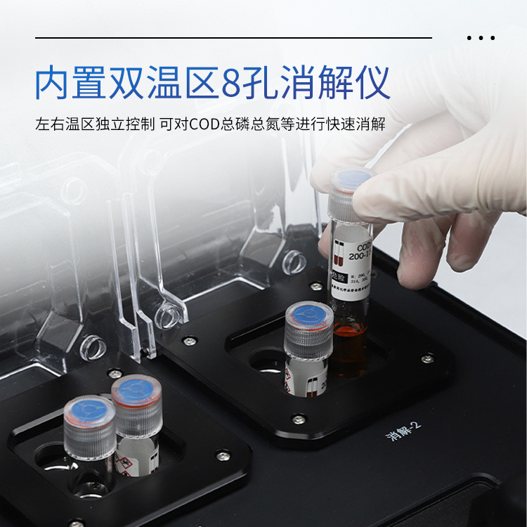4、内置双温区8孔消解仪,左右温区独立控制,可对COD总磷总氮等进行快速消解。