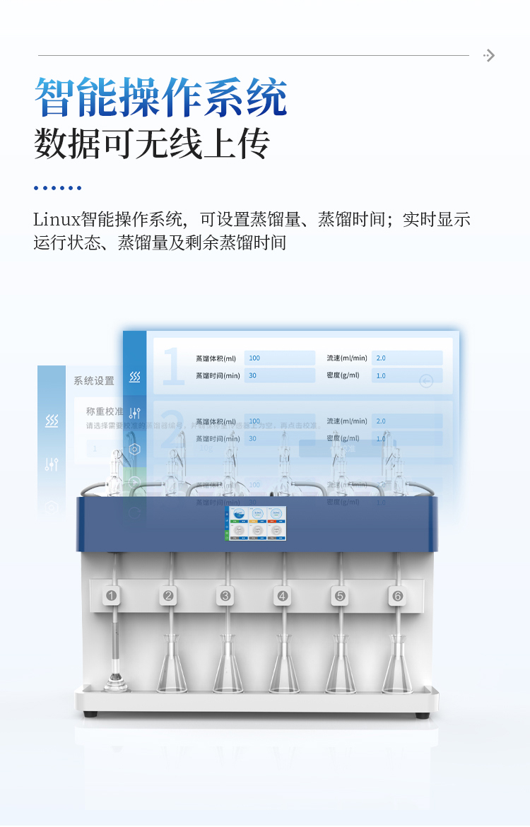 智能一体化蒸馏仪采用智能模块化设计:方法自定义设置保存/读取、开机自动调取使用,冷凝单元特殊定制蛇形冷凝管、智能终点控制防过量蒸馏、防倒吸保护,防干烧保护、实现了智能操作简单、自动蒸馏、美观实用、节能降耗、节省人工的同时为用户做样提高效率节约人员成本开销。