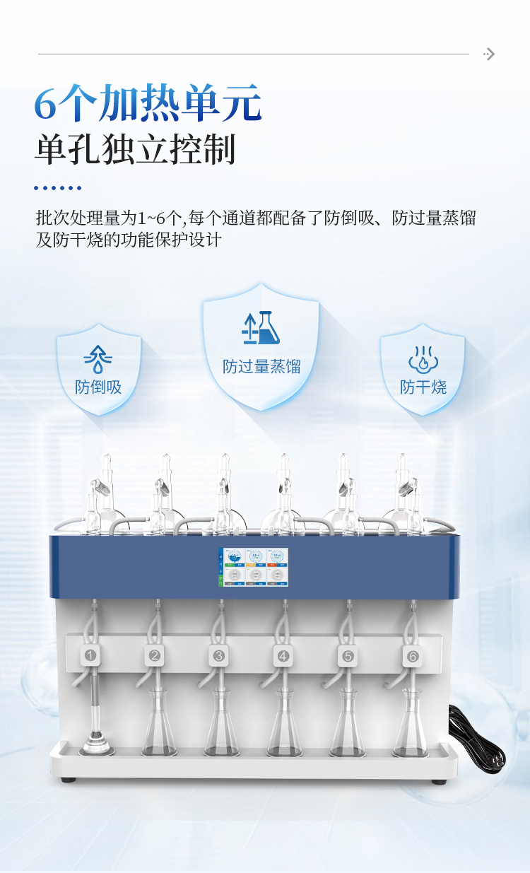 1、批次处理量为1~6个,每个通道均独立控制,并且每个通道都配备了防倒吸、防过量蒸馏及防干烧的功能保护设计;