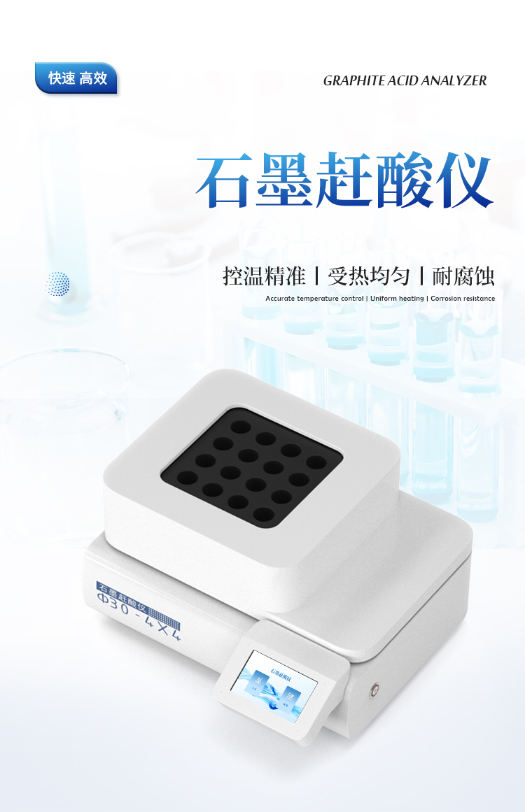 石墨消解仪采用优质高纯石墨材质,结合精确的环绕立体加热技术,确保消解孔间温差极小,有效保障了批量样品处理的平行性与结果准确性。智能PID温控系统支持高精度程序升温,用户可灵活设定并存储多组消解程序,操作简便,重现性极佳。同时,仪器具备超温保护、漏电保护等多重安全机制,配合耐腐蚀设计及友好的操作界面,在提升实验效率的同时,全力守护实验安全。