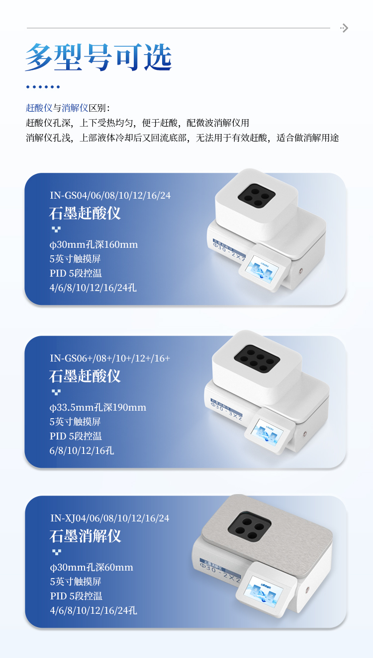 本石墨消解仪是替代传统电热板、电热炉的理想选择,同时仪器采用经典的30 mm孔径设计,完美兼容市场主流的50 mL、100 mL消解管,是实验室值得信赖的得力助手。
