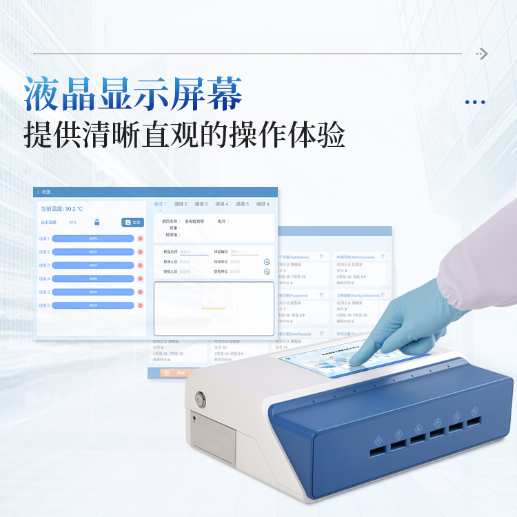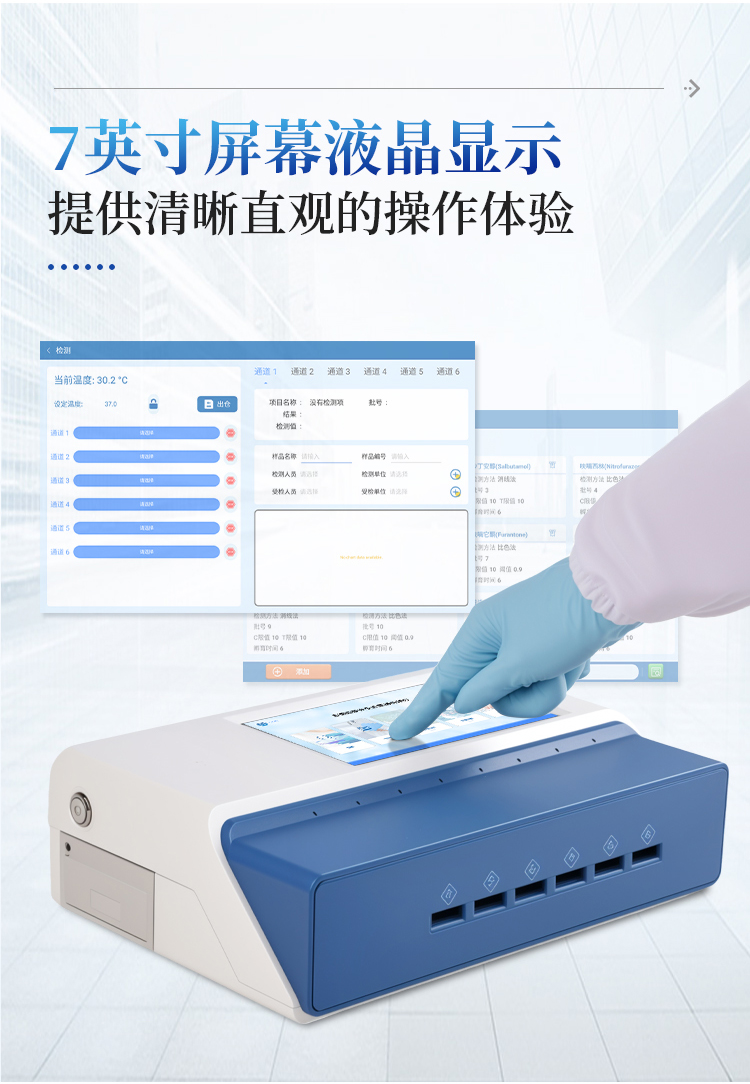 16、检测结果:报告出检测项目、被测物质的结果、检测单位、被检查单位、检验员、检测时间、检测限等信息可在触摸屏上显示,可通过仪器内置打印机输出