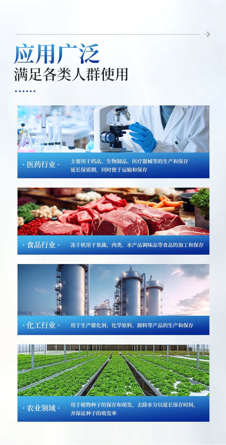 1. 医药行业:冻干机在医药行业中应用广泛,主要用于药品、生物制品、医疗器械等的生产和保存。通过冻干技术,可以去除水分,延长保质期,保证药效和生物制品的活性,同时便于运输和保存。
