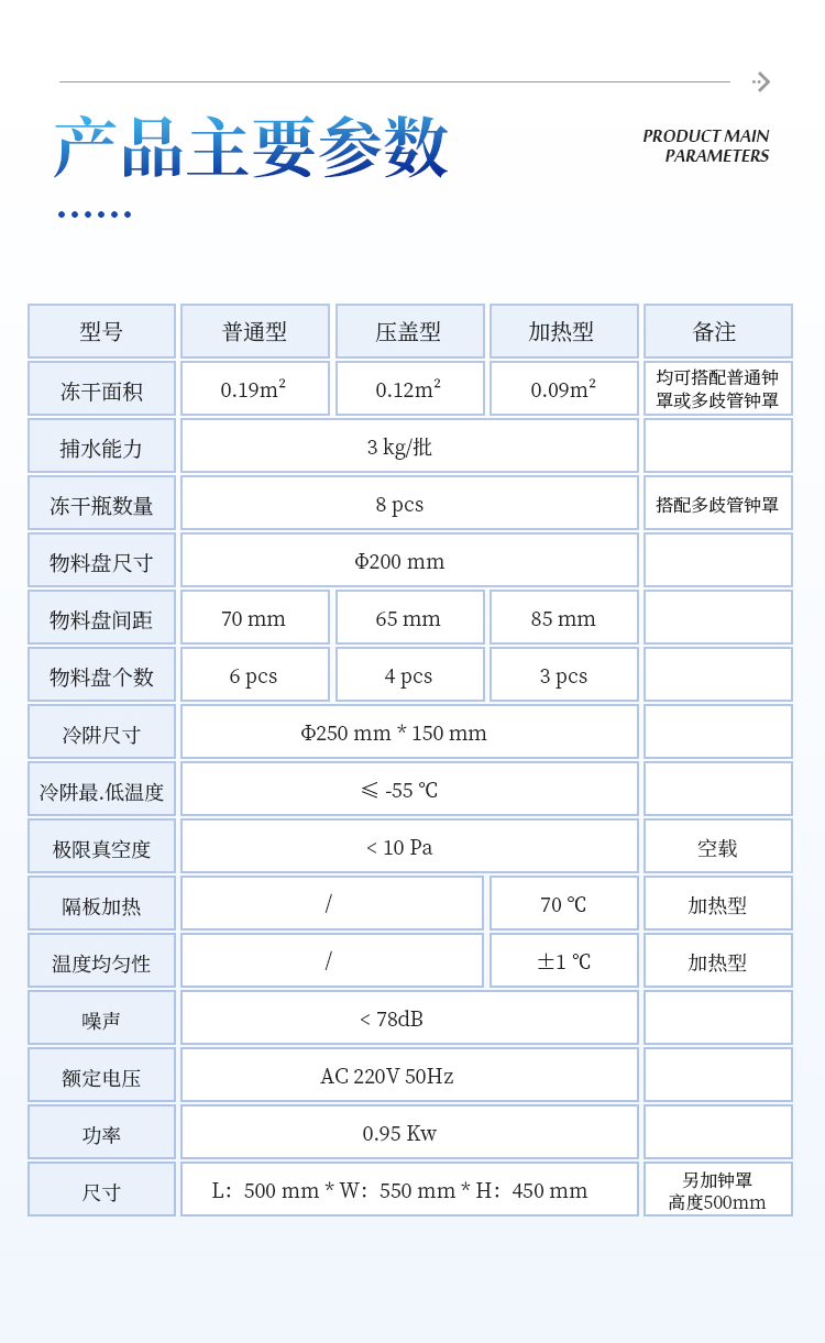 | 冻干面积 | 0.19 m² | 0.12 m² | 0.09 m² | 均可搭配普通钟罩或多歧管钟罩 |