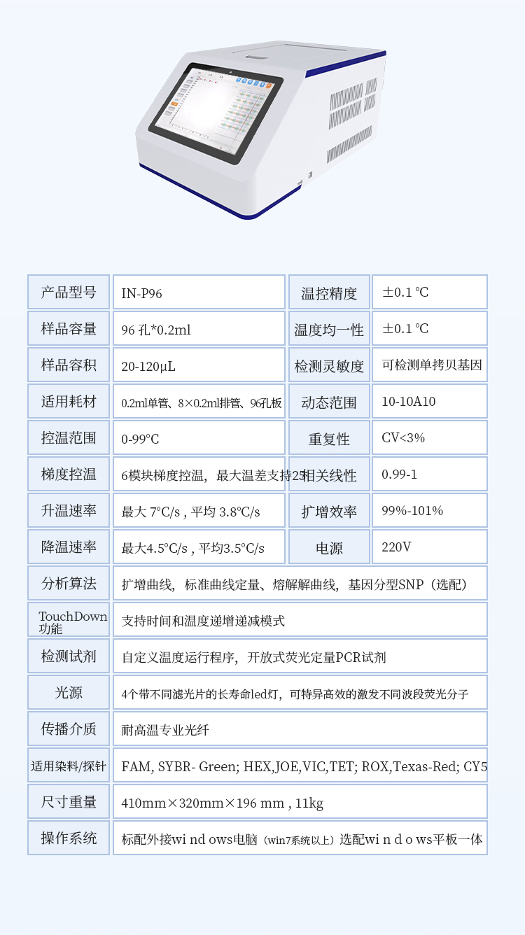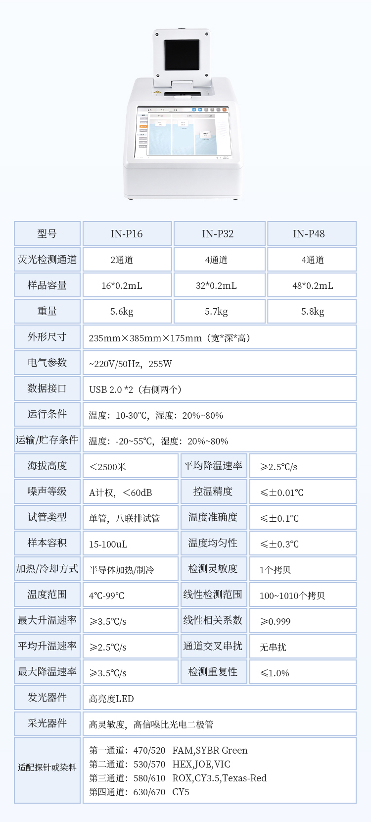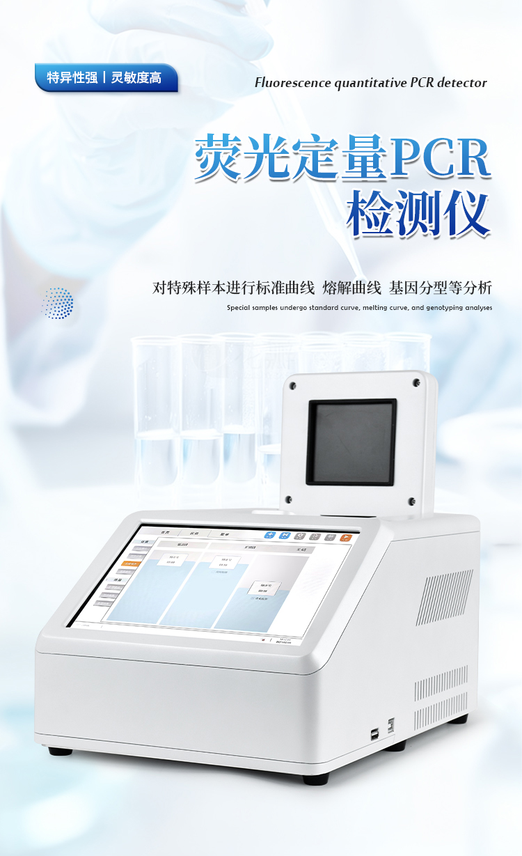 实时荧光定量PCR系统主要用于运行实时荧光定量PCR实验,通过荧光激发和采集的方式,对实验过程进行实时监控,将实验过程数据绘制成荧光曲线,实时呈现于仪器显示界面,并对实验数据进行拟合和分析,最后可生成PDF格式的实验报告。 对取于其他动物体内的生物样本(如血液,体液等)中包含的目标核酸,进行快速精准的定性和定量分析,同时也能够对特殊样本进行标准曲线,熔解曲线,基因分型等分析。