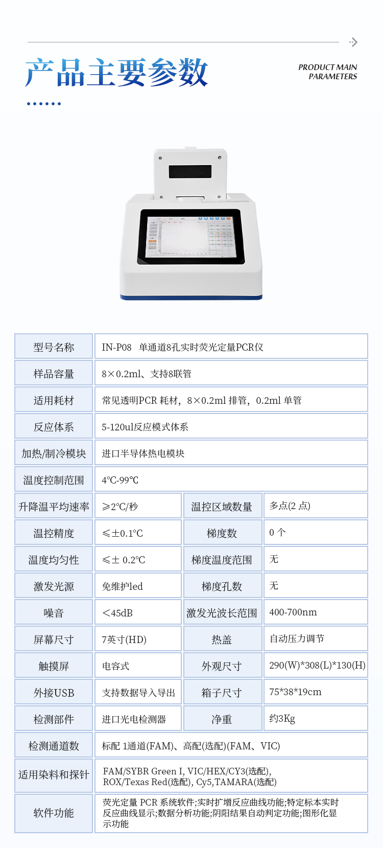 7.软件功能强大:荧光定里 PCR 系统 软件;实时扩增反应曲线功能;特定 标本实时反应曲线显示;实时温度曲 线;数据分析功能;阴阳结果自动判定功能;图形化显示功能等。