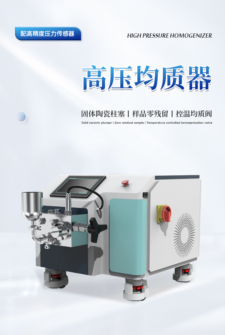 高压均质机是以高压往复泵为动力传递及物料输送机构,将物料输送至工作阀部分。物料在通过工作阀的过程中,在高压下产生强烈的剪切、撞击和空穴作用,从而使液态物质或以液体为载体的固体颗粒得到超微细化。