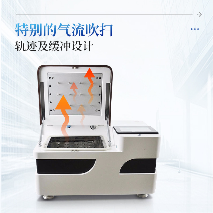 2、特别的气流吹扫轨迹及缓冲设计:可加速溶剂蒸发浓缩、防止溶剂喷溅损失;