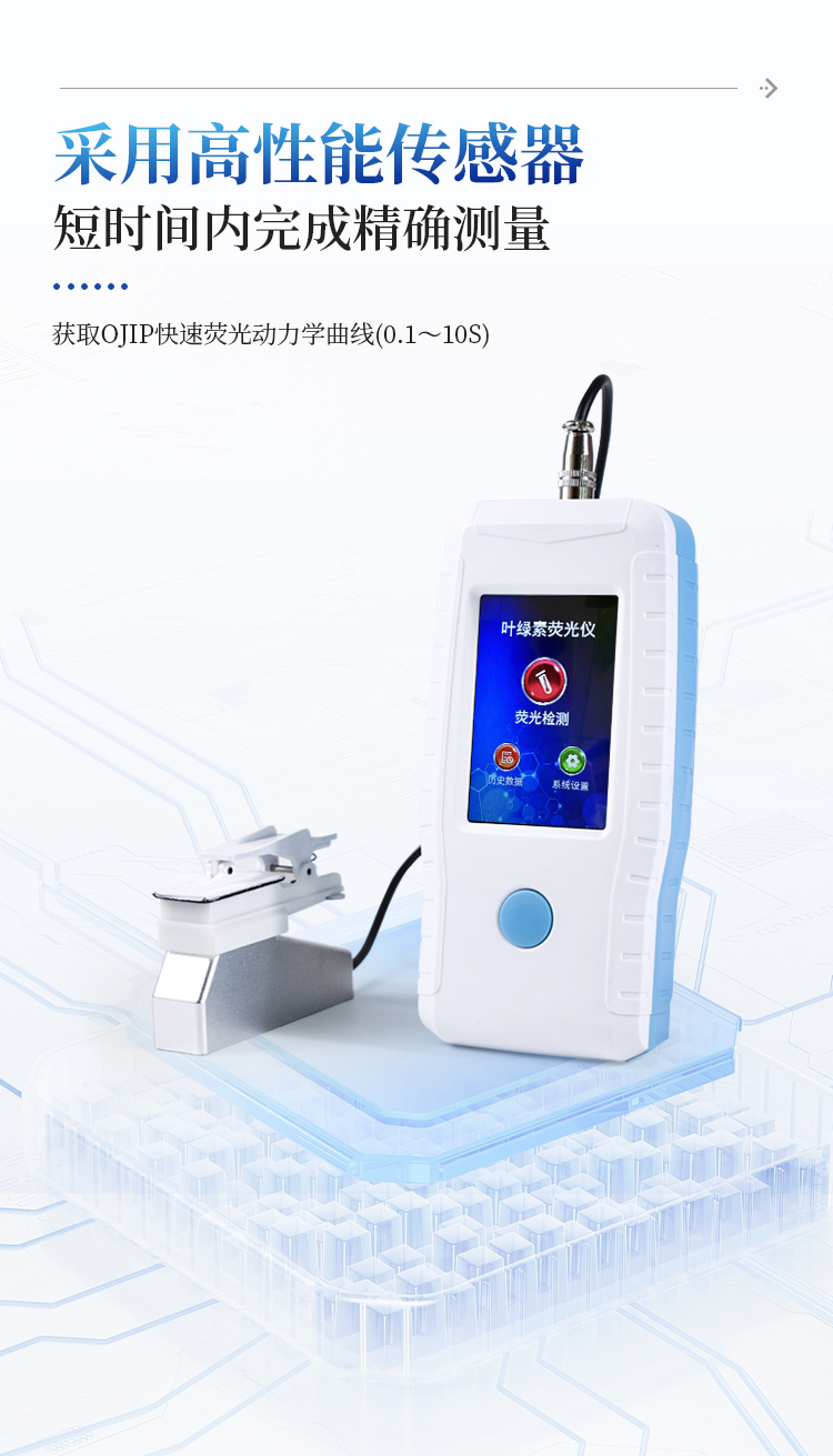 叶绿素荧光仪器可以用于生物学,农林栽培育种,生态保护,生物耐受性,环境污染等方面的教学和科研工作。获取OJIP快速荧光动力学曲线(0.1~10s) 测定的基本参数为:Fo,Fj,Fi,Fm(Fp)